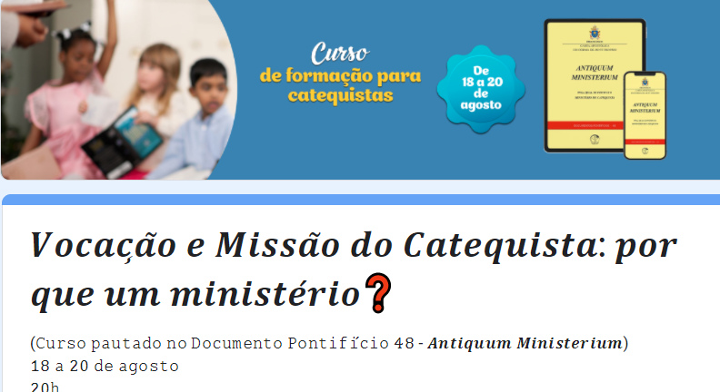Destaque, Notícias Diocesanas Curso para Catequista: Vocação e Missão do Catequista: Por que um ministério Leia Mais Whatsapp Facebook-f Pinterest Twitter Destaque, Notícias Diocesanas Curso para Catequista: Vocação e Missão do Catequista: Por que um ministério Leia Mais Whatsapp Facebook-f Pinterest Twitter