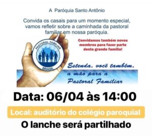 Neste sábado (06/04), a Matriz de Santo Antônio estará realizando um momento de reflexão para a criação da Pastoral Familiar em Gurupi. Segundo Pe. Eldinei Carneiro o objetivo, é resgatar a Pastoral Familiar na paróquia, e também trabalhar com casais casados, casais de segunda união e casais em união estável, é unir a família. O evento acontecerá no colégio Paroquial às 14h, todos os casais são convidados a participar.
