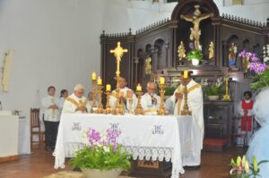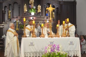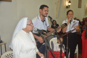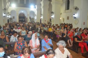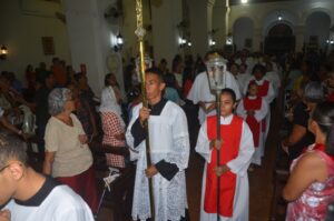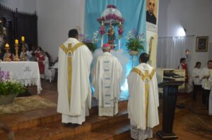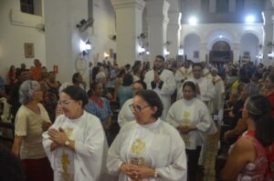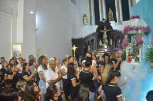 Dom José Moreira presidiu nessa última sexta-feira (15), a Abertura Oficial do Festejo de Nossa Sra das Mercês, em Porto Nacional – TO. Na homilia, Dom José destacou o aspecto mariano:”Maria é a mulher de fé, que nos leva até o seu filho Jesus, completamos hoje às dores de Nossa Sra, que essa novena ajude toda a nossa Diocese”. A missa teve uma participação ativa do Colégio Sagrado Coração de Jesus, que completou 119 anos. Os funcionários entraram da procissão de entrada, do ofertório oferecendo flores a Maria e no final com várias velas acesas e cantando a música sementeira de luz. A missa foi concelebrada pelos Monsenhores Juraci Cavalcante e Jones Pedreira. Também o Pe. Eldinei Carneiro (Pároco) e Pe. Douglas Aires (Vigário). Com o tema:”Vocação, Graça e Missão” e o Lema: “Corações Ardentes, Pés a Caminho”. Aproximadamente 1000 fiéis participaram da missa. A celebração foi transmitida ao vivo pelo redes sociais da Paróquia Catedral Nossa Sra das Mercês, Portal Porto Mídia e Rádio Porto FM 87,90.