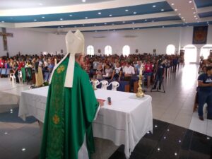 O IV Congresso Diocesano da Renovação Carismática Católica foi encerrado ontem (02), com uma missa presidida pelo Bispo Dom Romualdo Matias, às 09:00, na Paróquia Santo Antônio, em Gurupi – TO, no Sul do Estado. Na homilia Dom Matias pediu firmeza na fé e perseverança para vencer as correntes ideológicas do mundo hodierno: “É preciso viver a fé na coerência e não de aparência, precisamos superar o rigorismo e formalismo farisaico, que leva para o vazio”. E finalizou: “Nesse sentido vocês da renovação têm muito a oferecer, porque procuram viver o radicalismo evangélico”. Ao final da missa, o coordenador da Foraria de Gurupi, Leonardo Glória fez uma oração e um agradecimento ao Bispo: “Estamos muito felizes com os 10 anos de vida episcopal do senhor, temos orgulho de tê-lo como nosso pastor diocesano”. Ainda enfatizou: “Nossa gratidão ao Pe. Eldinei, que abriu as portas da paróquia para nos receber”. O Pároco, Pe . Eldinei Carneiro expressou sua gratidão: “Primeiramente agradecemos a Deus pelo bom êxito desse congresso, ao nosso bispo Dom Romualdo, pela presença e comunhão, demonstra que estamos no caminho certo. Agradeço a coordenadora Diocesana Ana Lúcia, o coordenador estadual, Cícero Batista, a secretária geral, Marilúcia Moura, aos coordenadores forâneo e paroquial, Leonardo e Cleber. E por fim, agradeço aos Padres Lucas e Heldeir, diretor forâneo e estadual da RCC”. E concluiu: “Jesus está batendo na nossa porta, esse foi o tema do congresso, bate significa provocar. Ele deseja entrar no nosso coração e no mais profundo do nosso ser, mas é preciso uma resposta nossa, porque Ele não viola e não agride a liberdade do homem, deixemos Jesus fazer morada no nosso ser”. O congresso teve início na última sexta-feira (31) e encerrou ontem. Várias palestras foram desenvolvidas: 1 – Chamado a intimidade com Deus (Amor de Deus), 2 – Conversão Sincera (Pecado), quanta vida eu tiver e lhe darei (Jesus Salvador e Senhorio de Jesus) e 4 – Eis que estou a porta e bato. O congresso foi marcado por momentos de cura, oração, adoração, confissão e um grande show com a Banda Dominus. Aproximadamente 700 pessoas participaram do evento. O próximo congresso acontecerá em 2020, mas sem local definido. O tema geral do congresso 2018 foi o seguinte: “Eis que estou a porta e bato”. Simultaneamente aconteceu o Congressinho para as crianças, coordenado por Elaine Beatriz. Aproximadamente 80 crianças, que foram evangelizadas e fizeram uma experiência profunda com Jesus.