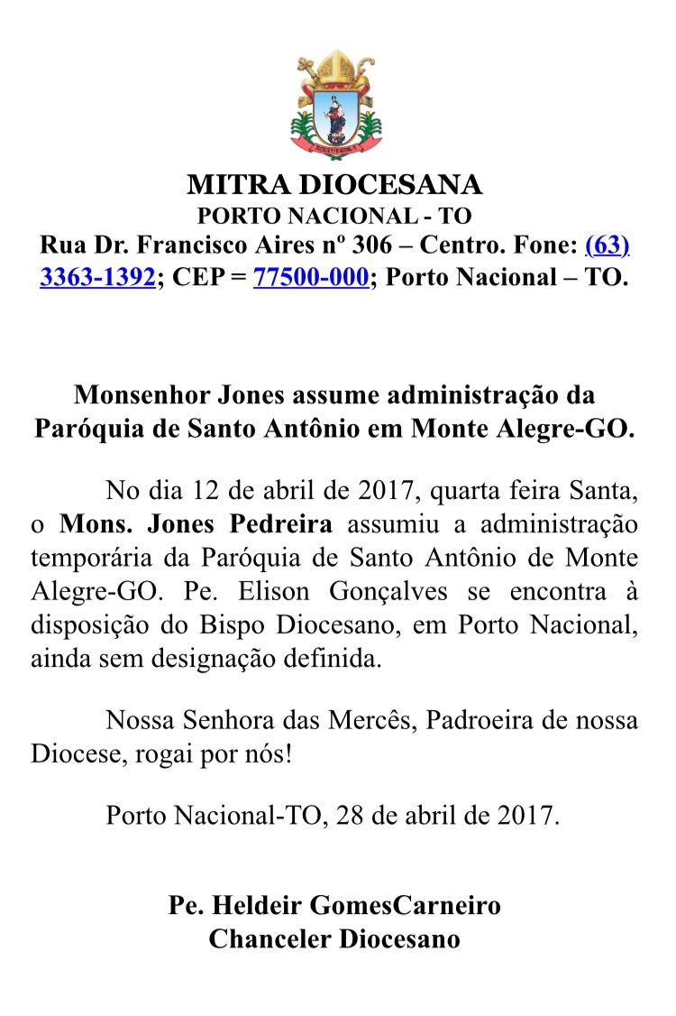 Mons. Jones Pedreira Assume Administração da Paróquia Santo Antônio em Monte Alegre-GO.