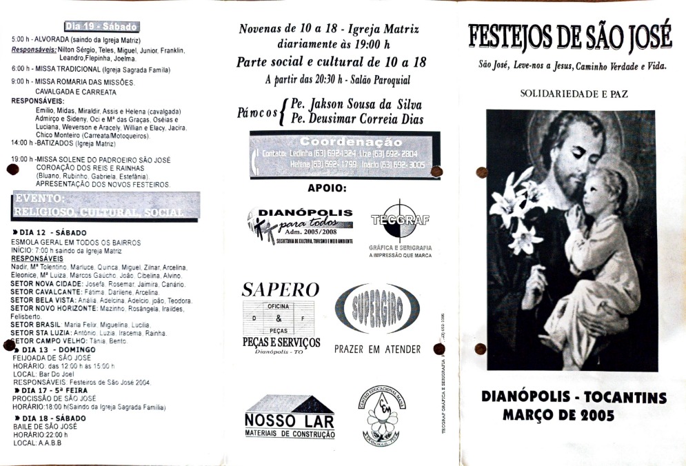 O tradicional Festejo de São José já faz parte do Calendário Cultural do estado do Tocantins e reúne milhares de fiéis das regiões próximas e da cidade de Dianópolis todos os anos. Essa tradição de fé e devoção acontece no mês de março e conta com a participação popular na sua mobilização e realização, mostrando o engajamento da população católica no sudeste do Estado. Conheça mais sobre a história da festa do padroeiro de Dianópolis, contada pelo antigo pároco e pela comunidade envolvida na sua organização.
