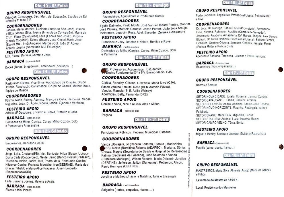 Hoje eu faço parte da pastoral do dízimo na paróquia, faço parte do grupo de voluntários, e ainda sou, ainda me tenho como catequista. No Festejo de São José aconteciam os novenários como acontece hoje ainda, só que acontecia onde hoje é o escritório paroquial e é o centro de catequese. Na época, o espaço de festa não tinha esse espaço grande que tem hoje. Era bem pequeno, não era aquele movimento que tem hoje. Os Festejos de São José naquela época aconteciam o novenário com as missas e com a quermesse. Só que não tinha tanta coisa não, o festejo veio dar uma uma levantada assim e passou para uma festa de grande porte, foi com o padre Jakson para cá, o padre Jackson deu início e depois foi o padre Gleibson, que entrou e fez aquele movimento que mexeu com a cidade toda e os outros que passaram depois deram continuidade, e foi assim que foi acontecendo. Era algo assim muito positivo, e o pessoal contribuía muito, tinha gente que matava gado na época e doava os quilos de carne aí na porta da igreja.