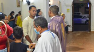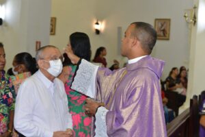 Na homilia, Pe. Eldinei pontuou: “A Igreja nos oferece a cada ano oportunidade de desenvolver na vida espiritual, a primeira leitura do livro de Joel falava sobre isso, voltai para o Senhor, porque Ele é bondoso, compassivo, clemente e misericordioso. Já a segunda leitura nos coloca como embaixadores de Cristo, somos representantes do Senhor”. E completou: “No evangelho, temos os três relacionamentos para vivermos bem o tempo quaresmal: relacionamento com Deus (oração), relacionamento com o próximo/irmão (caridade) e relacionamento conosco mesmo (jejum)”.