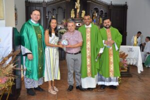 Na homilia Pe. Ezequiel falou da liturgia: “Um administrador esperto com as coisas dos outros, o senhor espera de nós uma atitude de fidelidade”. Ao final da missa, o Pároco Pe. Eldinei Carneiro deu as boas-vindas ao Pe. Dal Pozzo: “Bendito aquele que vem em nome do Senhor, é motivo de muita alegria tê-lo aqui conosco”. O Pe. Eldinei Ainda ofertou uma lembrança da Padroeira ao religioso. O Pároco convidou o Prefeito Ronivon Maciel e a Primeira Dama Keila Maciel para presenteá-los com uma lembrança da padroeira. O gestor fez uso da palavra: “Para nossa cidade é uma satisfação receber o Pe. Ezequiel nessa noite, nós sabemos a importância de Nossa Sra das Mercês para os portugueses e parabenizo Pe. Eldinei Carneiro pelo dinamismo pastoral”.