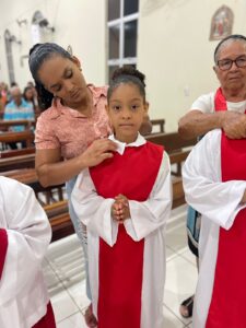 Após a homilia houve o rito de investidura, onde o padre abençoou as vestes litúrgicas e os pais ajudaram as crianças a se vestirem e foram, então, declarados como coroinhas da Paróquia Bom Jesus dos Aflitos.