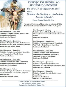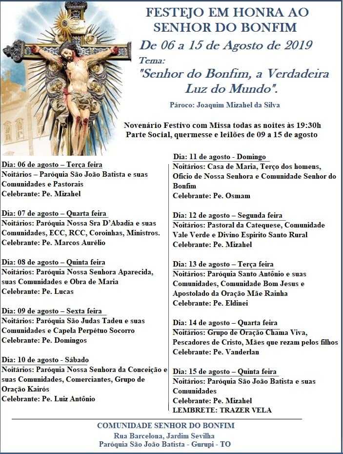 Programação Festejo em honra ao Senhor do Bonfim – Capela Senhor do Bonfim Gurupi /To
